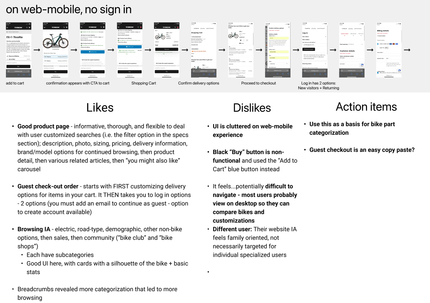After getting some understanding of the bike e-commerce space,I explored several bike online shops to see how they accomplished the same tasks such as navigation, IA, and checkout, as well as looked at other large purchase websites such as Sennheiser, known to be an expert in their field for audio tech.